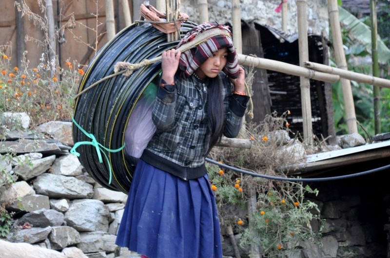 Rano, kilka minut po 6.00, wyruszyliśmy w drogę. Część mężczyzn z rurami i zbiornikami wyszła już wcześniej. Za nami szły dwie dziewczyny w wieku 14 i 16 lat. Każda z nich dźwigała zwój rur ważący ponad 70 kg. Nie wierzyłam własnym oczom, jak to zobaczyłam i strasznie mnie to zbulwersowało. Pasang wytłumaczył mi, że one są przyzwyczajone do tego. Wioska jest niewielka, większość mieszkańców to starcy i dzieci, więc kto miał przyjść? Muszę przyznać, że czułam się strasznie skrępowana, niosąc na plecach niewielki plecaczek.