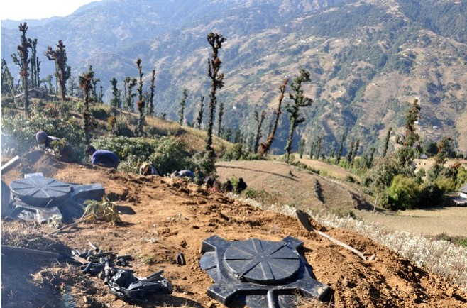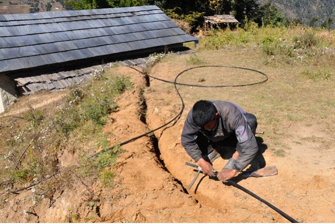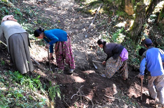 Po porannej herbacie udaliśmy się do strumienia, skąd było prowadzone ujęcie wody. W tym miejscu rozpoczęto kopanie rowu, w który potem wpuszczona została rura. Poszli z nami zarówno mężczyźni, kobiety, jak i dzieci. Pomagał nam chłopak z Kathmandu – hydraulik. Ludziom kopanie szło bardzo szybko, byłam zaskoczona tempem prac.