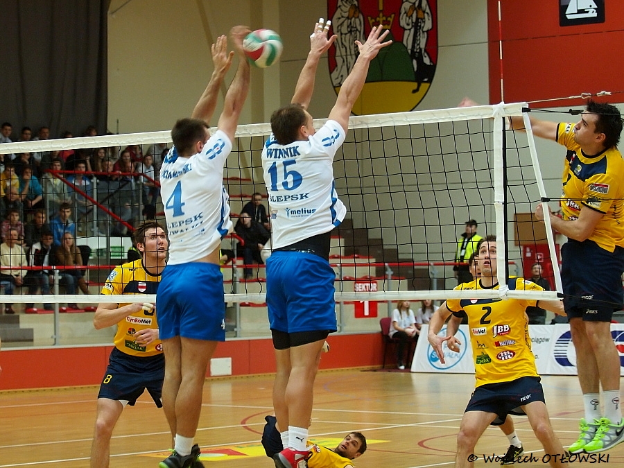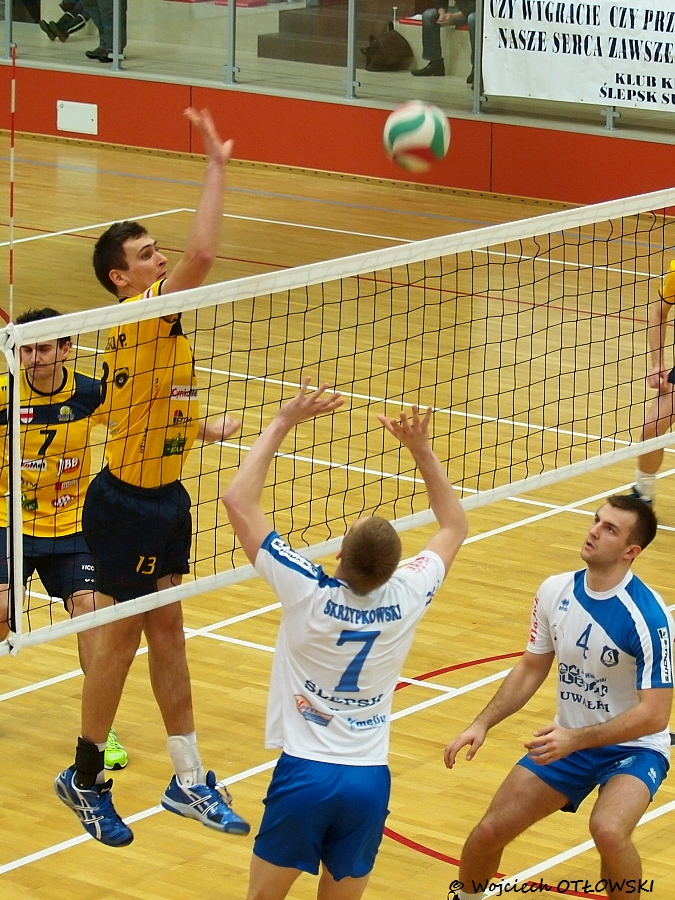 Początek pierwszego seta był wymianą punkt za punkt. Od remisu 8:8 siatkarze Ślepska zagrali jednak skuteczniej od gości i wypracowali sobie przewagę trzech „oczek”: Po krótkiej Mariusza Schamlewskiego gospodarze prowadzili 12:9 i kontrolowali przebieg seta aż do jego zwycięskiego końca – 25:20.