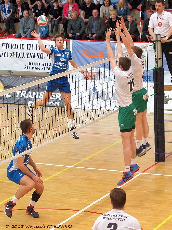 26.04.2015, Suwalki, Hala OSiR, I liga siatkowki mezczyzn, Play-Off: Slepsk Suwalki – Victoria Walbrzych. Atakuje Krzysztof Modzelewski.