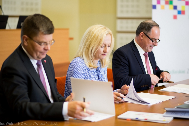 Ponad 55,8 mln zł łącznie zasili budżety wymienionych samorządów. Prezydenci Białegostoku, Łomży i Suwałk podpisali dziś z Zarządem Województwa Podlaskiego aneksy do umów. Umowy dotyczą inwestycji drogowych, które zostały zrealizowane z programu RPO WP 2007-2013 a dodatkowe środki wynikają z podwyższenia wartości dofinansowania inwestycji do 100 proc.