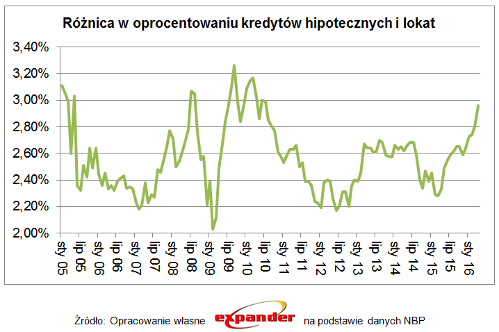 Porównując średnie oprocentowanie nowo zakładanych lokat i zaciąganych kredytów hipotecznych okazuje się, że różnica w tych stawkach w kwietniu była bardzo wysoka i wyniosła 2,96%. W ciągu ostatnich 10 lat zbliżone poziomy występowały tylko w połowie 2008 r. i od połowy 2009 r. do połowy 2010 r. Niestety wiele wskazuje na to, że w przyszłości różnica ta może być jeszcze większa. Projekt nowej ustawy o kredycie hipotecznym zakłada bowiem, że banki udzielające takiego finansowania nie będą mogły jednocześnie sprzedawać kredytobiorcy innych usług poza bezpłatnym rachunkiem lub kontem oszczędnościowym. To oznacza, że tego typu kredyty staną się dla banków mniej zyskowne, co zapewne zostanie uwzględnione w ich oprocentowaniu.