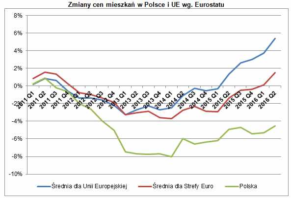 Według danych Eurostatu Polska jest na ósmym miejscu od końca pod względem zmian cen mieszkań w porównaniu z poziomem z 2010 r. Od tego czasu do 2014 r. koszty nabycia nieruchomości w naszym kraju spadły aż o 8%. Później zaczęły rosnąć, ale znacznie wolniej niż w innych państwach. Podczas gdy średnio w Unii wzrosły od 2010 r. o nieco ponad 5%, u nas wciąż są o 4,5% niższe. W rezultacie mieszkanie, które wówczas kosztowało np. 300 000 zł, dziś jest warte 286 000 zł. Gdybyśmy natomiast byli europejskim średniakiem, to jego wartość wynosiłaby 316 000 zł.