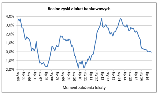 Poza tym wartość wpłaconych na lokatę pieniędzy nieco spada przez inflację. Od połowy 2014 r. nie musieliśmy się jednak tym martwić, gdyż ceny przeciętnie spadały, a nie rosły. Dzięki temu, mimo że banki obniżały oprocentowanie lokat to realne zyski oszczędzających rosły. W przypadku lokat zakładanych w lutym 2014 r. wyniosły aż 3,75%.