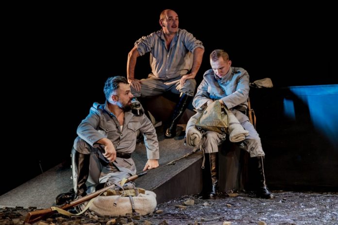 – Pomysł inscenizacyjny naszego spektaklu polega na tym, aby połączyć dwie warstwy: rzeczywistą i meta rzeczywistą. Pierwsza z nich została stworzona w oparciu o podstawowy tekst sztuki Zygmunta Nowakowskiego. Zawarte są w niej także oryginalne piosenki. Jest to warstwa czystej narracji tego, co się dzieje w akcji. Druga warstwa powstała m.in. w oparciu o nowe piosenki – dopisane przez Iwonę Kusiak, a także poprzez stworzenie figury chóru, który równoważy męską część bohaterów sztuki. Taka koncepcja pozwala nam pokazać nie tylko świat męski, ale także to, jak wojnę mogą widzieć kobiety; jak wygląda ona z punktu widzenia matek, kochanek, sufrażystek. Ukazanie tych dwóch światów jest niezwykle ważne dlatego, że w tym roku świętujemy 100. rocznicę odzyskania niepodległości, ale także stulecie uzyskania praw wyborczych przez kobiety w Polsce – powiedział Rafał Matusz.