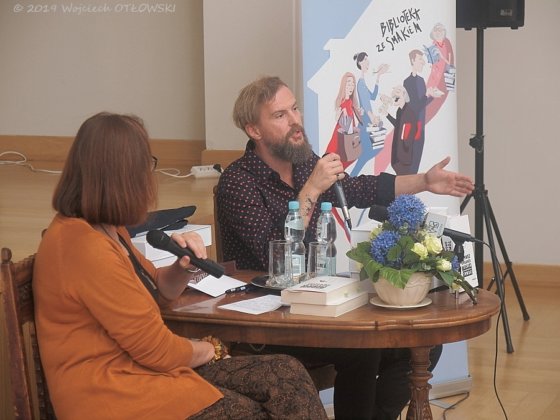 Rozmowę z autorem poprowadziła dyrektor Biblioteki Publicznej, Maria Kołodziejska. Pierwsze pytanie dotyczyło źródła inspiracji „Teorii opanowywania trwogi”. Choć bohatera trudno utożsamiać z autorem, to sama opowieść wyrosła niejako z osobistych przeżyć. Jako nastolatek Tomasz Organek stracił ojca. Dla szesnastolatka było to doświadczenie formacyjne, przyspieszające osiągnięcie dojrzałości. To poczucie śmiertelności od owego momentu towarzyszy artyście. A samo sięgnięcie po pisarskie środki wyrazu sprowokowane zostało niejako przypadkiem. Otóż na studiach okoliczności sprawiły, że Tomasz Organek trafił na zajęcia z języka francuskiego nie do końca odpowiadającego jego poziomowi zaawansowania. Nudząc się na lektoracie zaczął… pisać bajki. Potem sięgnął po kolejne formy – opowiadania, teksty piosenek. Tu, jak fani doskonale wiedzą, nastąpił dłuższy przystanek, ale chęć przekazania przemyśleń, obserwacji, refleksji kazała artyście podjąć się stworzenia opowieści o Borysie, trzydziestodziewięciolatku, który szuka swego miejsca, próbuje znaleźć sposób, by owo tytułowe poczucie trwogi wyciszyć, ukoić.