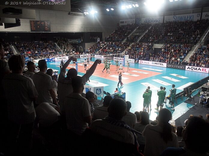 23 XI 2019; Suwałki Arena; Plus Liga; Ślepsk Malow – Indykpol AZS Olsztyn 3:1, w tle klub kibica