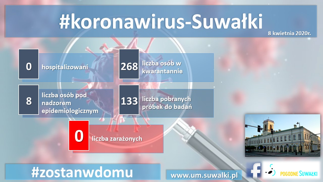 Wojewoda Podlaski i Podlaski Państwowy Wojewódzki Inspektor Sanitarny informują o siedemnastu kolejnych przypadkach zakażenia koronawirusem w regionie, potwierdzonych pozytywnymi wynikami testów laboratoryjnych. W Suwałkach nadal nie wykryto choroby. W kwarantannie przebywa 268 osób.