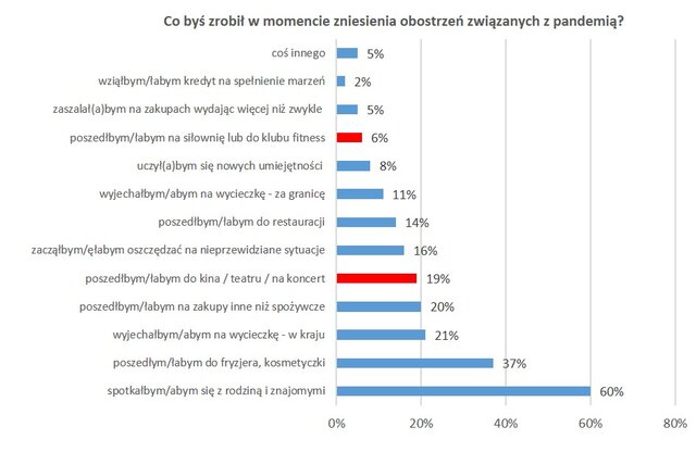 Jak bardzo zmieni się sytuacja tych podmiotów w związku ze zniesieniem ograniczeń? O ile o powrocie na siłownie i baseny w badaniu przeprowadzonym dla BIG InfoMonitor przez Maison&Partners wspominało tylko 6 proc. pytanych, o tyle wyjście do kina czy teatru rozważa już blisko co piąty pytany. To znaczy, że na możliwość zobaczenia filmu w kinie czy doświadczenia przedstawienia w teatrze czeka całkiem sporo widzów, którzy najwyraźniej mają dość namiastek tego typu rozrywki w postaci transmisji online i kinowych serwisów strumieniowych.