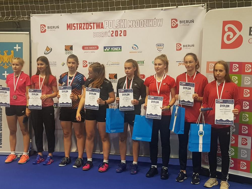 Medal zdobyły dziewczęta w grze podwójnej Oliwia Niedźwiedzka i Natalia Lenczewska. Suwalczanki w Bieruniu pokazały się z bardzo dobrej strony. W drodze po medal najpierw pokonały zawodniczki z Bierunia (gospodarz mistrzostw) Kingę Król/Laurę Płoszczyca 21:12, 21:12, i kolejne rywalki Anna Kotlarska/Nikola Nowińska (MKS Garwolin/UKS Korona Pabianice) także musiały uznać wyższość podopiecznych Jerzego Dołhana.