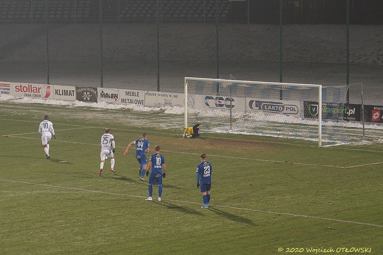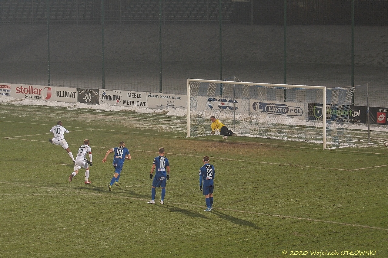 W drugiej połowie czuć było większą nerwowość zawodników i wprawdzie sędzia nie kwapił się z wyciąganiem żółtego kartonika, to jednak zachowanie Adriana Karankiewicza wymagało według niego ukarania. Sytuacja ta miała miejsce w 54 minucie, zaś dwadzieścia pięć minut później podobne przewinienie dostrzegł sędzia u Martina Dobrotki. Tym razem nie tylko żółtą kartką ukarany został gracz Wigier. Arbiter podyktował rzut karny, którego egzekutor – José Embaló – celnie ulokował piłkę w bramce. Wprawdzie Hieronim Zych odczytał jego intencje – rzucił się we właściwym kierunku, lecz piłka dosłownie prześliznęła się pod nim i wylądowała w siatce.