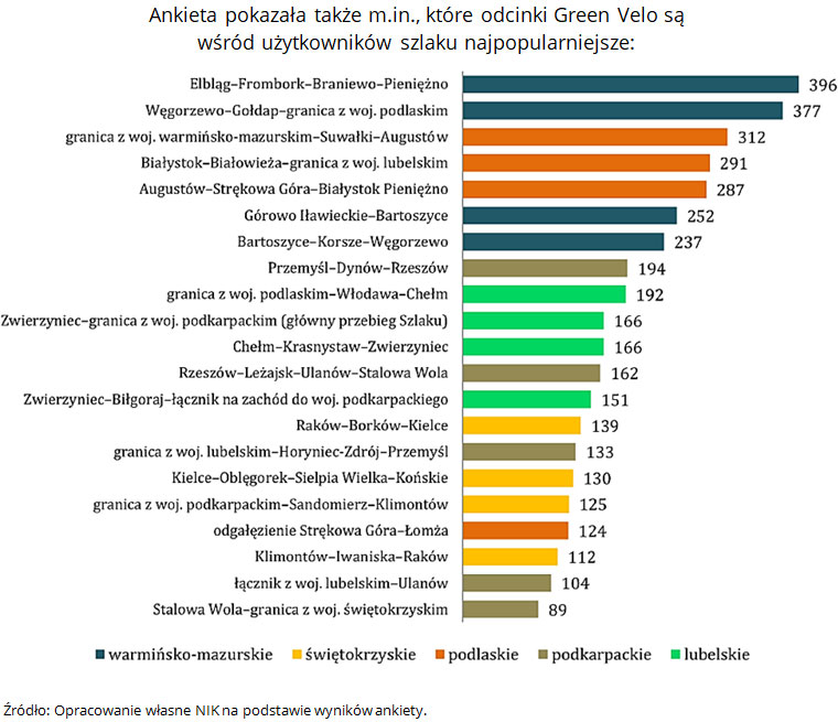 Żadnych badań ruchu turystycznego nie przeprowadziły kontrolowane gminy i powiaty. Tylko w 6 gminach gromadzono jednostkowe dane – często przy okazji realizacji innych zadań, lokalnych wydarzeń lub w ramach obserwacji. Podobnie traktowano promocję szlaku, ograniczając się najczęściej do zamieszczenia na własnych stronach linków kierujących na portal poświęcony Green Velo. Niewiele kontrolowanych gmin i powiatów prowadziło działania promocyjne na szerszą skalę i potrafiło wykazać konkretne środki, jakie przeznaczyły na ten cel.