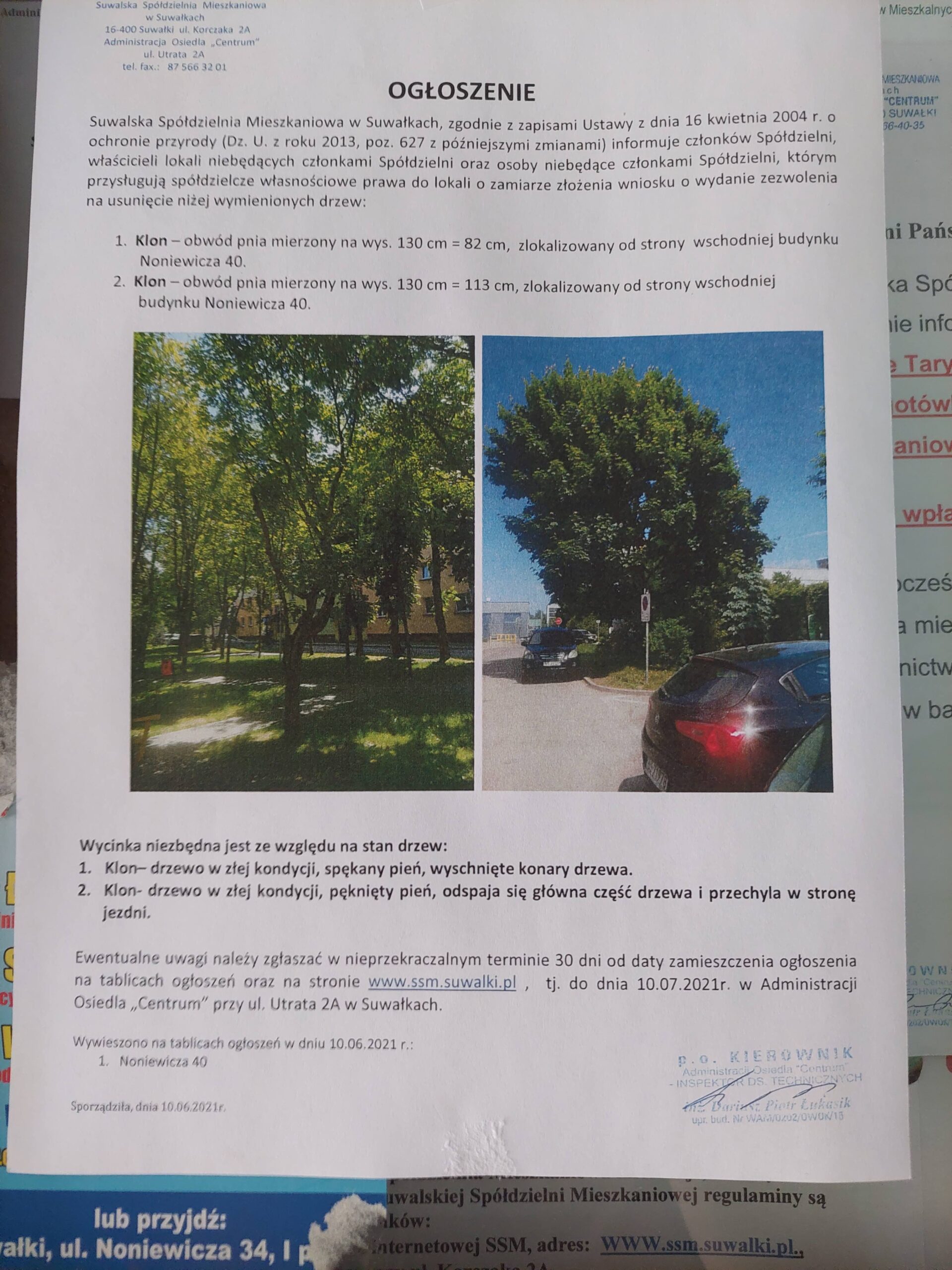 Suwalska Spółdzielnia mieszkaniowa zamierza wyciąć dwa klony w centrum miasta, w sąsiedztwie centrum handlowego „Arkadia”. Nasi czytelnicy zwrócili uwagę na ogłoszenie dotyczące tych planów wycinki.