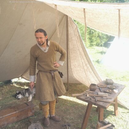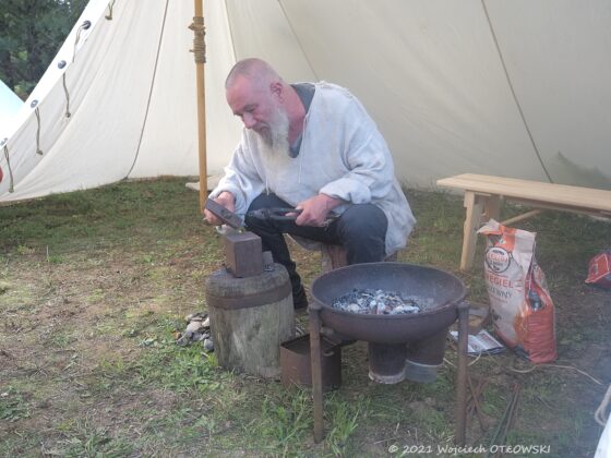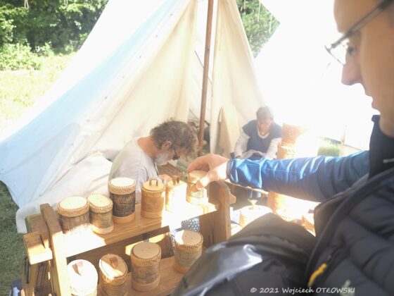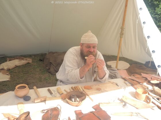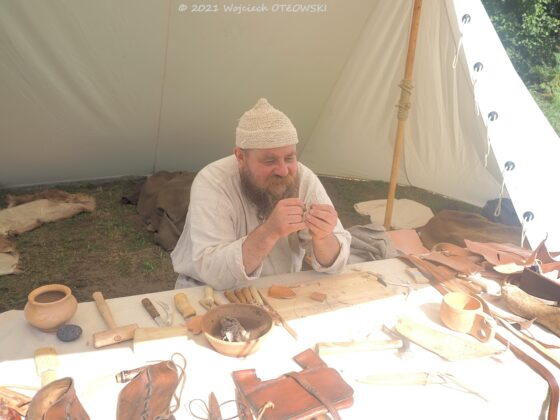 Prezentujący dawne rzemiosło chętnie odpowiadali na pytania, dzielili się swoją wiedzą. A są to niezwykle intrygujące informacje. Specjalista od starożytnego skórnictwa pokazywał misterne sposoby szycia, które na zewnętrznej stronie przedmiotu nie są w ogóle widoczne. Co ciekawe, do szycia używano niecodziennych „igieł”, bo było to długie, sztywne włosie z grzbietu dzika (nazywanego chybem). Zakończone jakby miotełką było dodatkowo jeszcze rozdzielane, a potem skręcane w jedno z nicią do szycia. Taka igła z włosia jest elastyczna, więc umożliwiało to spajanie nawet niewielkich kawałków skóry. Dodatkowo przedmioty takie, na przykład łapcie, były impregnowane: woskiem lub woskiem z dziegciem, który dawał ochronę przed grzybami i zniszczeniem.