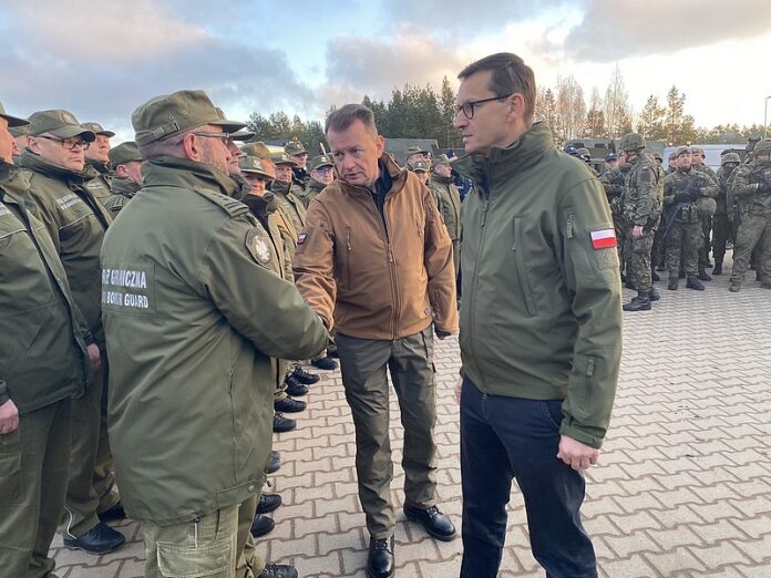 Premier Mateusz Morawiecki i Mariusz Błaszczak, minister obrony narodowej spotkali się 9 listopada w Kuźnicy Białostockiej z funkcjonariuszami Straży Granicznej, policjantami oraz żołnierzami i terytorialsami, którzy wspólnie strzegą bezpieczeństwa na granicy z Białorusią.