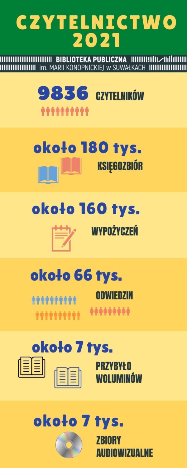 Biblioteka Publiczna im. Marii Konopnickiej w Suwałkach podsumowała 2021 rok. Pomimo trwających pandemiczych ograniczeń w budynku przy ul. E. Plater i filiach bibliotekarze zrealizowali około 160 tysięcy wypożyczeń dla 9836 czytelników.