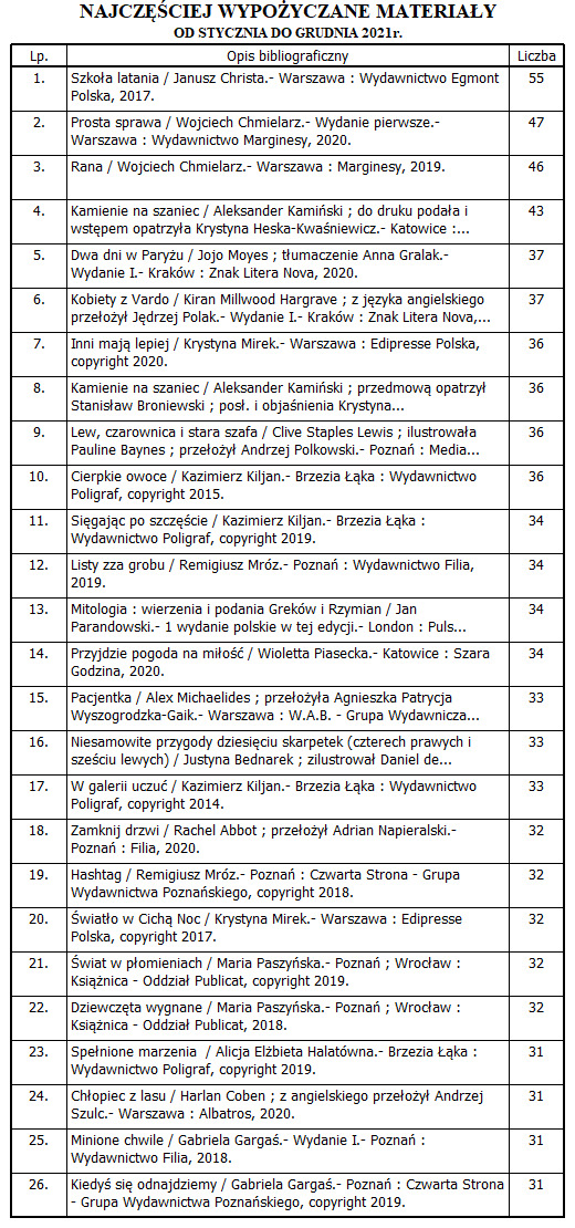 Według zestawienia przygotowanego przez bibliotekarzy, w pierwszej piątce najpopularniejszych książek znalazły się: komiks (Kajko i Kokosz), powieść kryminalna i sensacyjna autorstwa Wojciecha Chmielarza, lektura szkolna („Kamienie na szaniec”) oraz powieść dla kobiet. Inni popularni autorzy to m.in.: Kazimierz Kiljan, Remigiusz Mróz, Maria Paszyńska i Gabriela Gargaś.
