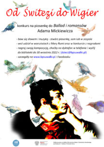 Wakacje na półmetku, zatem raczej o szkole jeszcze nie myślimy, a tu bibliotekarze zachęcają wszystkich do pochylenia się nad twórczością Mickiewicza. Bez obaw – czas kanikuły zobowiązuje, będzie to zatem zadanie, z którego uczestnicy wywiążą się – nomen omen – śpiewająco! Okazja ku temu jest wyjątkowo – wszak dwieście lat temu, od wydania „Ballad i romansów”, rozpoczął się wielki przewrót w polskiej literaturze, kulturze, sztuce. To właśnie rok 1822 jest uważany za początek polskiego romantyzmu, zatem trzeci konkurs na piosenkę ogłoszony przez suwalską Bibliotekę Publiczną twórczości wieszcza dotyczy.