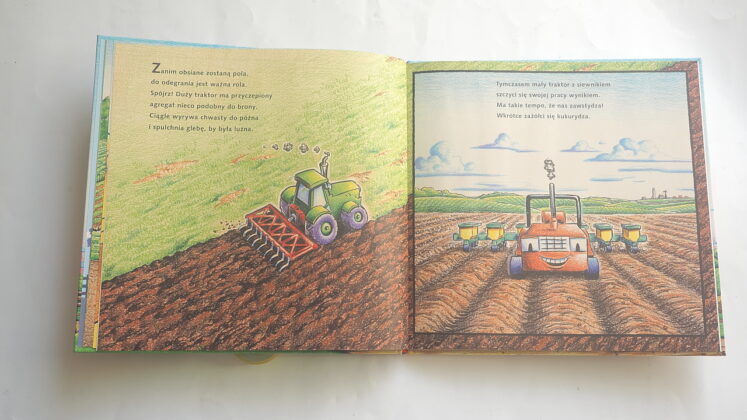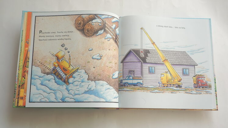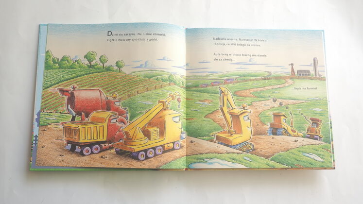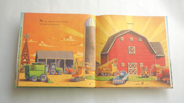 Rymowany tytuł („Na placu budowy… pasą się krowy!”) od razu wprowadza w temat – pasące się krowy kojarzymy z wiejskimi, rolniczymi terenami i tak jest w istocie: dzielne maszyny trafiają na farmę, by tu przez cały rok mierzyć się z rozmaitymi zadaniami. Znajdziemy więc to, co lubimy – maszyny, działanie, zgrabne rymy, które pozwalają najmłodszym zapamiętać historyjkę i dopowiadać zakończenia wersów. A do tego nowy tytuł przybliża życie na wsi – pokazane zostały prace typowe dla każdej z pór roku, uprawa roli, hodowla zwierząt. Cztery pory roku ukazane są już na wyklejce – maszyny zaczynają prace na farmie wiosną – trzeba poprawić dojazd, utwardzić drogę, potem przychodzi czas na prace polowe, porządki w obejściu, budowę obórki. Jesień to czas zbiorów, tak by zimą można było spokojnie odpocząć w oczekiwaniu na kolejny pracowity sezon.
