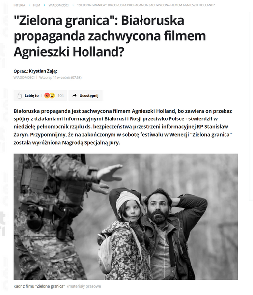 Ci rzekomo biedni cudzoziemcy, którzy w „Zielonej granicy” ukazani są, jako zagubieni, sympatyczni i delikatni poczciwcy, to w rzeczywistości liczna rzesza krzepkich, agresywnych i nie cofających się przed niczym intruzów, którzy od ponad dwóch lat szturmują polską granicę wschodnią, będącą jednocześnie zewnętrzną granicą Unii Europejskiej. Nieliczne przypadki obecności kobiet i dzieci w tym towarzystwie, uważać należy za element taktyki, stosowanej przez organizatorów hybrydowej białoruskiej agresji.
