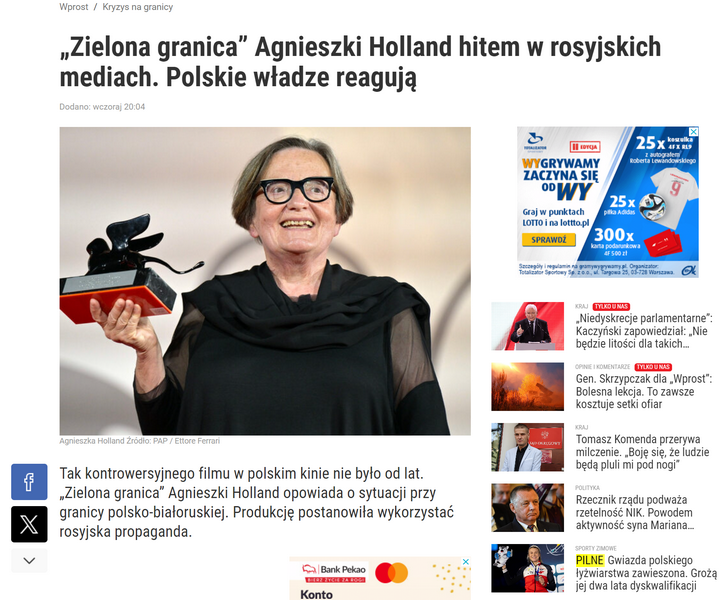 Słowa Agnieszki Holland, jakoby obrońcy polskiej granicy mieli przeciwko sobie co najwyżej inżynierów, lekarzy, czy literatów, brzmią jak ponury żart. Niemal codziennie do baz wracają z patroli granicznych nasze radiowozy z powgniataną karoserią i wybitymi szybami. Niech pani Holland powie w twarz naszym Chłopakom i Dziewczynom z granicy, że to, co na nich spada od strony Białorusi, to tylko suwmiarki, stetoskopy i stalówki. Uprzedzamy, że w odpowiedzi może nie dostać owacji na stojąco.