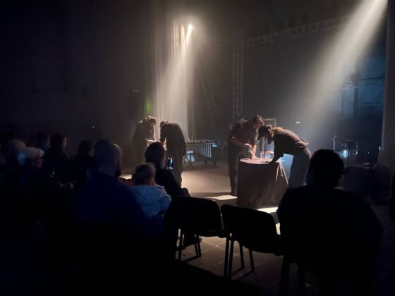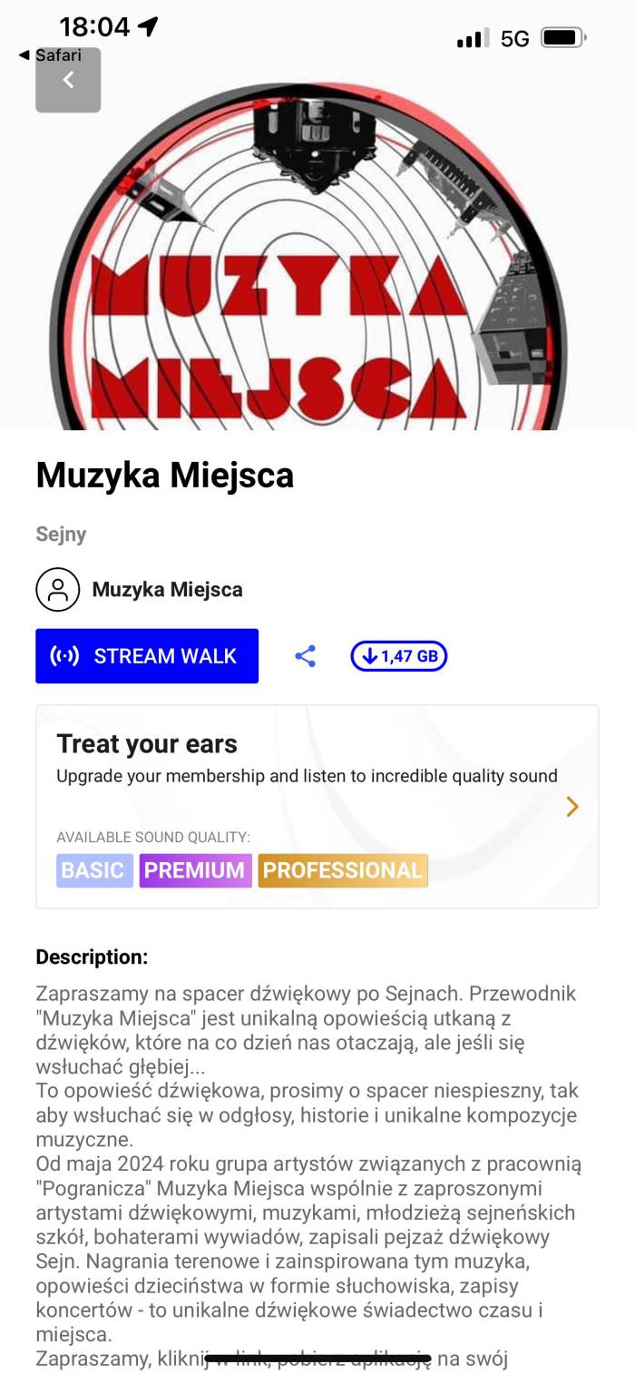„Często spotykamy się z muzykami, którzy przyjeżdżają, by razem z nami tworzyć nową muzykę. Ktoś opowiedział nam o narzędziu o nazwie Echoes, co po angielsku oznacza 'echa’. Uznaliśmy, że to bardzo przydatne, ponieważ wszyscy korzystamy ze smartfonów – nie tylko do komunikacji, ale też traktujemy je jako centrum multimedialne. To nasza rzeczywistość, której nie da się zmienić. Dlatego postanowiliśmy ten fakt wykorzystać. Stworzyliśmy mapę w aplikacji Echoes, którą można pobrać na każdy smartfon. Gdy włączy się ją w Sejnach, pierwszą mapą, którą zaproponuje, będzie 'Muzyka Miejsca’. To mapa satelitarna, która prowadzi użytkownika po mieście, odtwarzając dźwiękowe opowieści stworzone wspólnie z reżyserem dźwięku Marcinem Lenarczykiem. To historia o Sejnach, o których niektórzy z was mogą już nie pamiętać.”