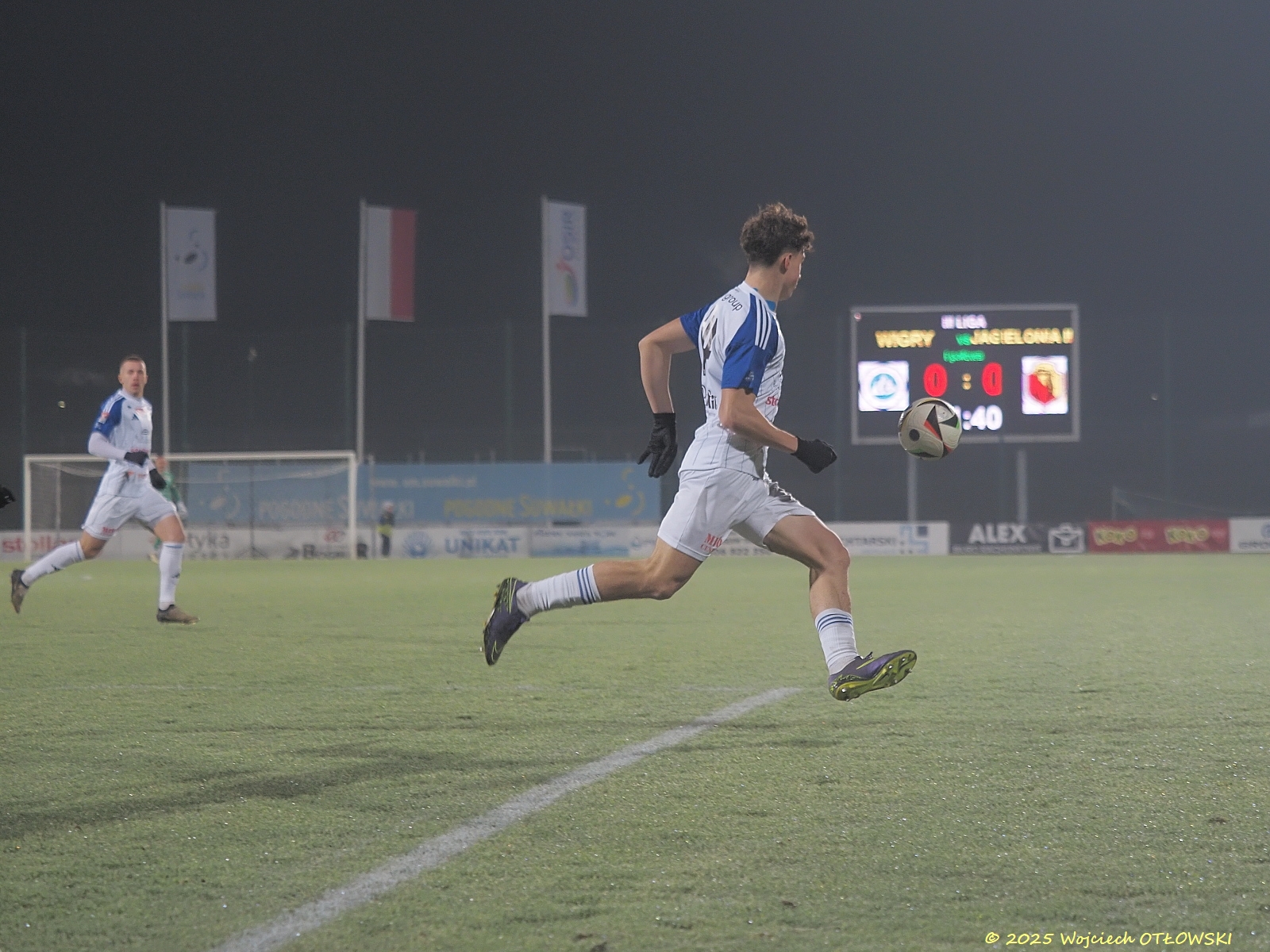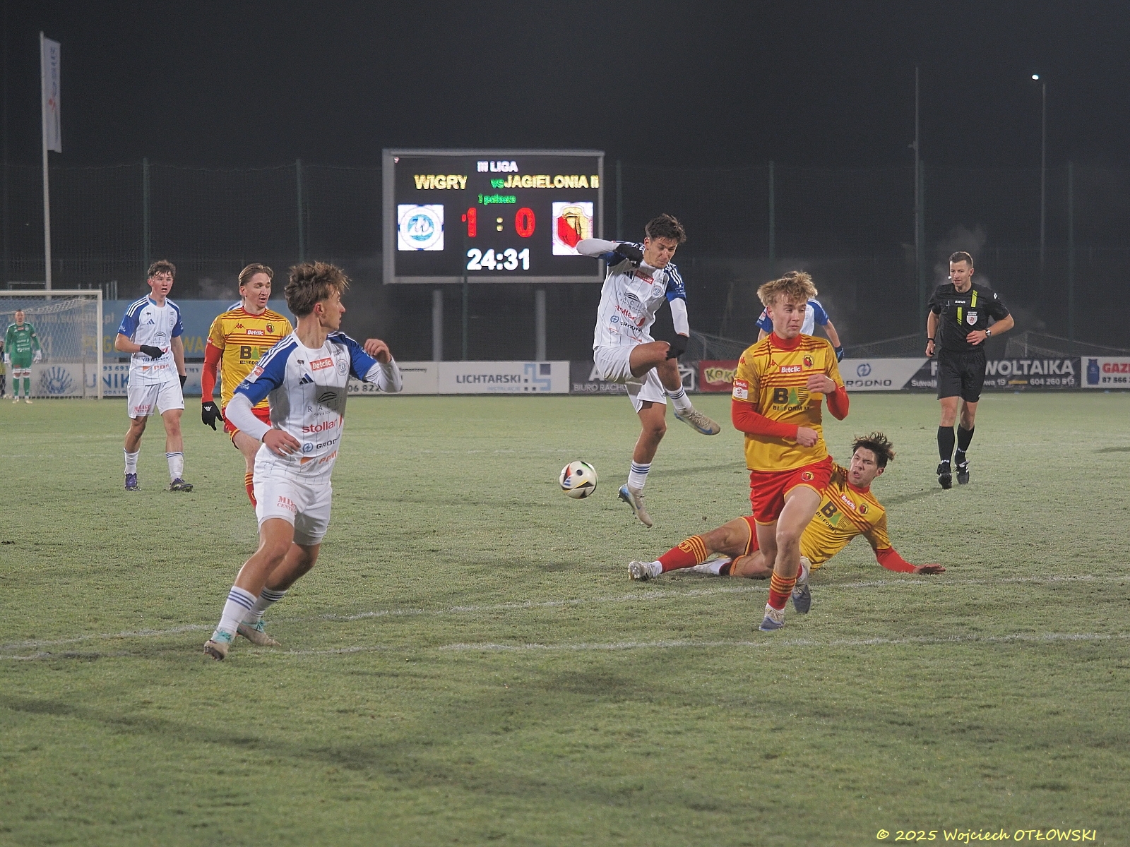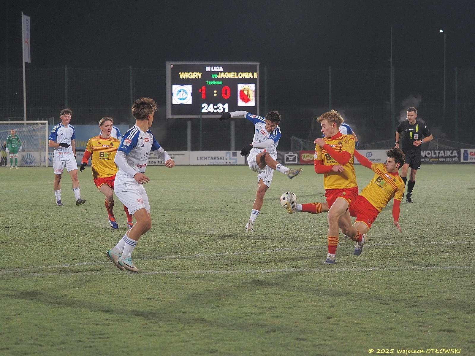 Oczywiście nie był to koniec emocji. Obie drużyny starały się osiągnąć swoje cele: Wigry podwyższyć wynik, a Jagiellonia II wyrównać – i szansa na to pojawiła się dla drużyny gości w drugiej połowie, gdy sędzia uznał za faul sytuację pod bramką Wigier. Na szczęście umiejętności Mateusza Taudula pozwoliły utrzymać czyste konto. Ucierpiały tylko palce bramkarza, zatem potrzeba była pomoc fizjoterapeuty.
