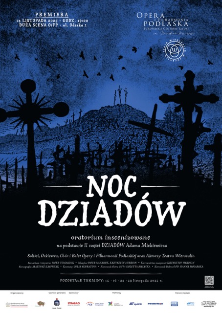 Spektakl powstaje w partnerstwie z Teatrem Wierszalin, znanym z mistrzowskich interpretacji twórczości Adama Mickiewicza. Na Dużej Scenie Opery i Filharmonii Podlaskiej wystąpią Orkiestra, Chór i Balet OiFP oraz gościnnie aktorzy Teatru Wierszalin. Libretto i reżyserię spektaklu przygotował Piotr Tomaszuk założyciel i dyrektor Wierszalina. Kierownictwo muzyczne objął Krzysztof Herdzin, scenografię przygotował Mateusz Kasprzak, a kostiumy Julia Skuratova. Premiera Nocy dziadów odbędzie się 14 listopada 2025 roku o godz. 19.00, a kolejne wydarzenia zaplanowane są w dniach 15, 16, 22 i 23 listopada.