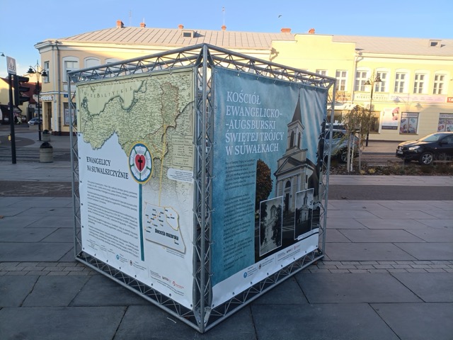 Wielkoformatowa plenerowa wystawa o dziedzictwie suwalskich ewangelików na Placu Marii Konopnickiej, przygotowana przez Radosława Krupińskiego, z wykorzystaniem zdjęć archiwalnych z zasobów parafii i osób prywatnych.
