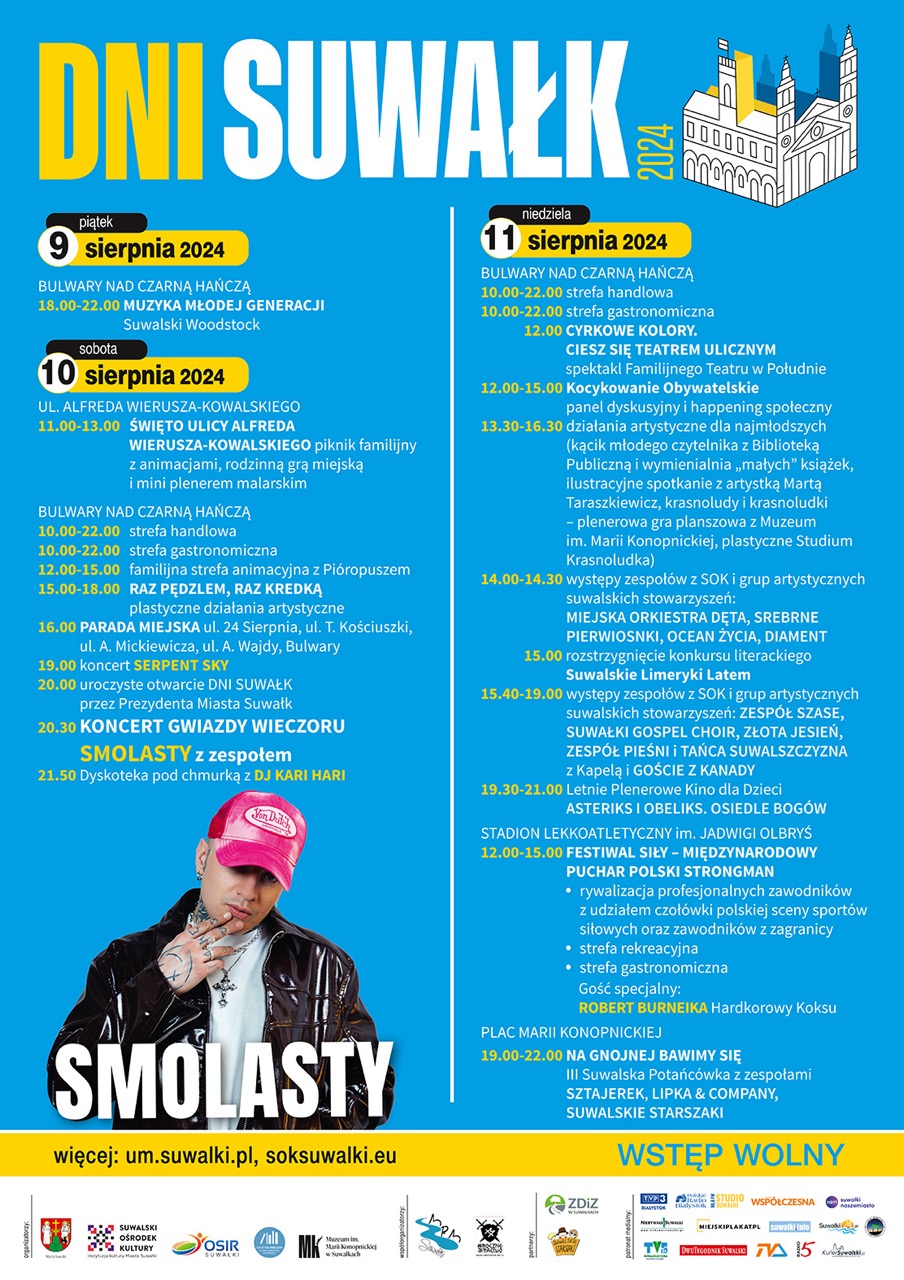 11. Suwalskie Teatr-Akcje 2024 „Powroty do domu” - PROGRAM Na niektóre spektakle i pokazy obowiązują wejściówki do odbioru w miejscu wydarzenia na godzinę przed rozpoczęciem. 25.07. (CZWARTEK) 18:00 „Showtime” – Teatr Form Czarno-Białych “Plama”, reż. M. Krymska (PREMIERA) Sala Kameralna SOK, ul. Jana Pawła II 5 (wejściówki) 26.07. (PIĄTEK) 15:00 Performensy Miejskie […]