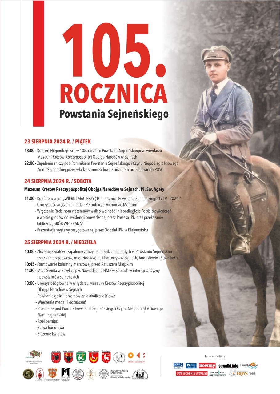 6 wydarzenia,P R O G R A M obchodów 105. rocznicy Powstania Sejneńskiego 23 sierpnia 2024 r. / piątek 18.00 Koncert Niepodległości w 105. rocznicę Powstania Sejneńskiego w wirydarzu Muzeum Kresów Rzeczypospolitej Obojga Narodów w Sejnach 22.00 Uroczystość zapalenia zniczy pod Pomnikiem Powstania Sejneńskiego i Czynu Niepodległościowego Ziemi Sejneńskiej przez władze samorządowe z udziałem przedstawicieli POW […]