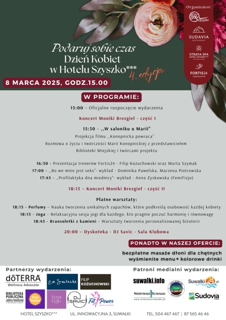 8 marca 2025 roku o godzinie 15:00 w Hotelu Szyszko w Suwałkach odbędzie się wyjątkowe wydarzenie z okazji Dnia Kobiet. Organizatorzy przygotowali bogaty program, który obejmuje koncerty, spotkania, warsztaty oraz … Czytaj dalej Podaruj sobie czas – Dzień Kobiet w Hotelu Szyszko w Suwałkach